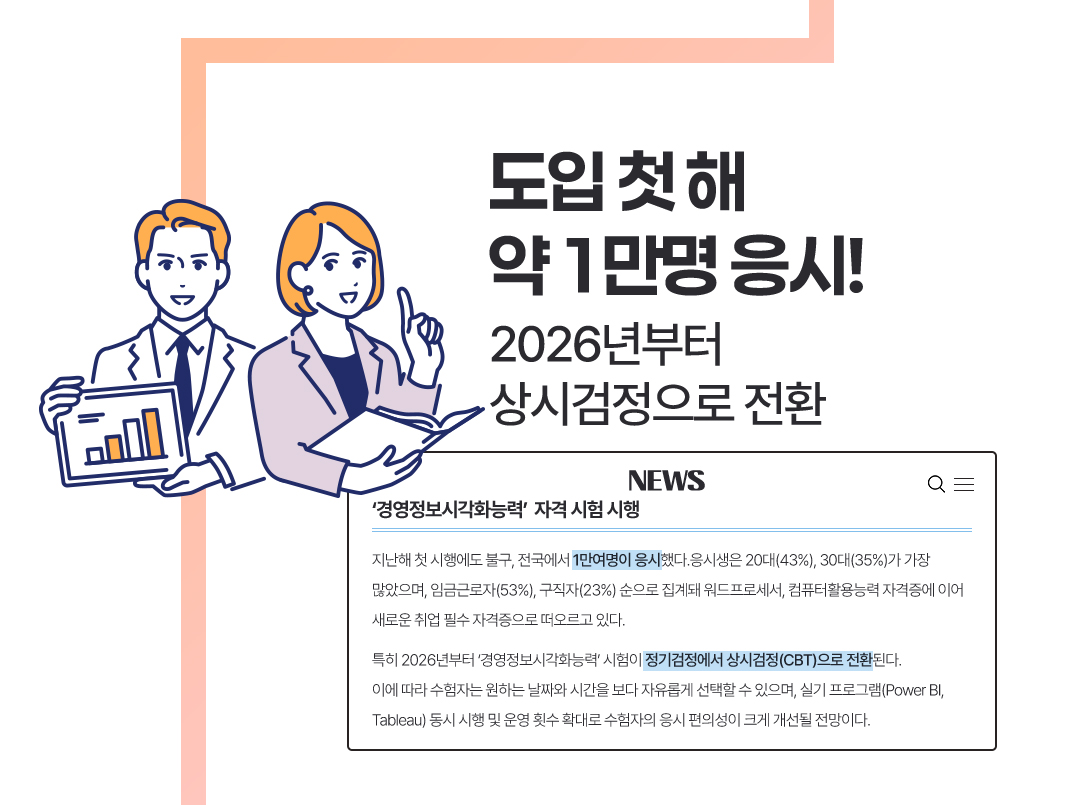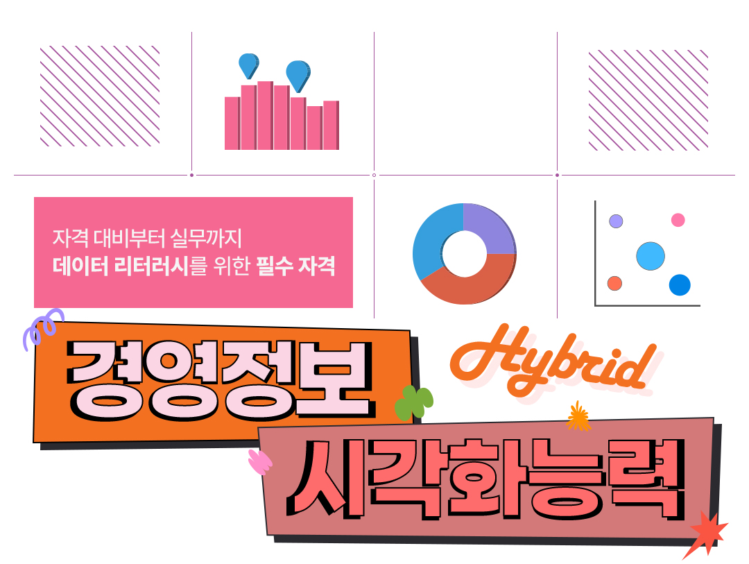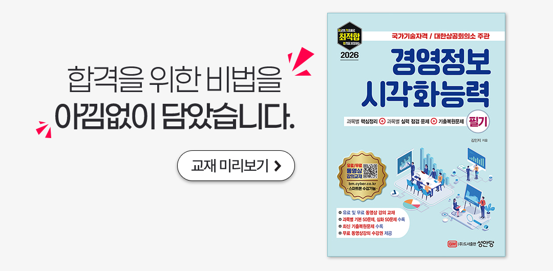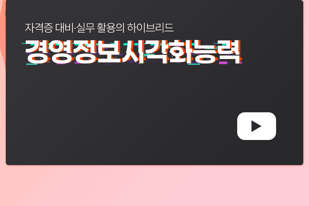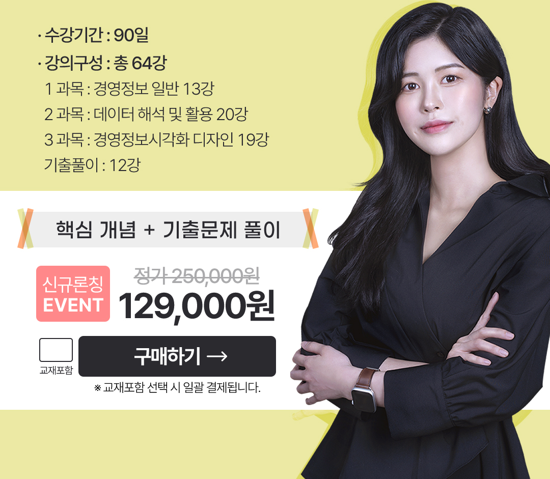 총 64강 1과목 : 경영정보 일반 13강 2과목 : 데이터 해석 및 활용 20강 3과목 : 경영정보시각화 디자인 19강 기출풀이 : 12강