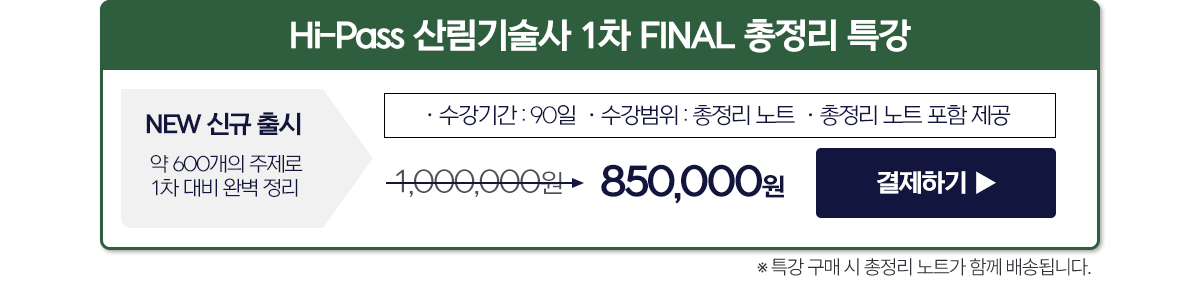 | 1. 수강 기간 | -Hi-Pass 산림기술사 1차 합격 패키지 : 120일 -Hi-Pass 산림기술사 1차 FINAL 총정리 특강 : 90일 |